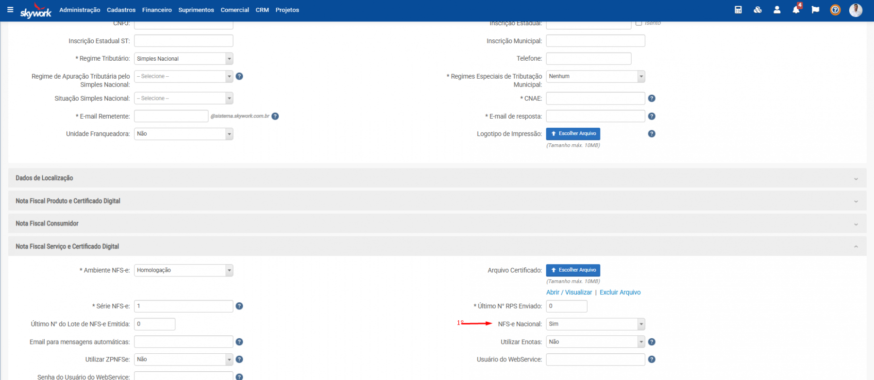Ative o campo NFS-e Nacional: Sim