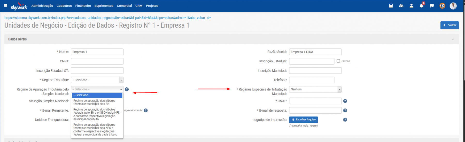 Preencha os campos de Regime Tributário e Regime Especial Municipal