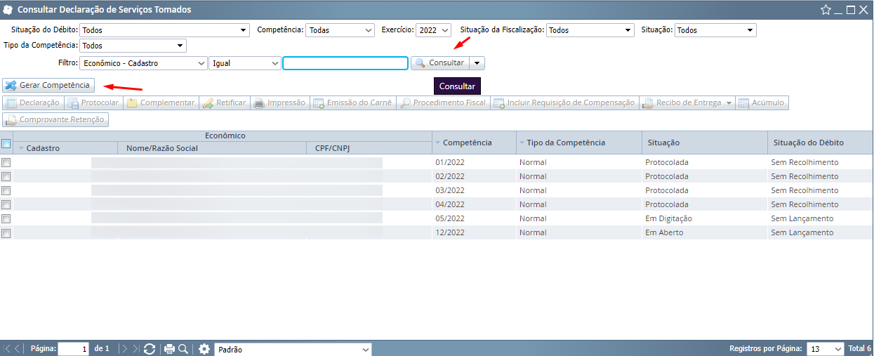 - Será exibido um novo popup com opções de consulta e também a opção “Gerar competência”. Na parte de consulta, você poderá visualizar as declarações já realizadas e identificar qual está pendente.