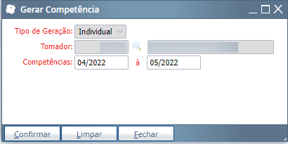 - Após localizar a competência em aberto, clique em “Gerar competência” e preencha as informações referentes ao período faltante.